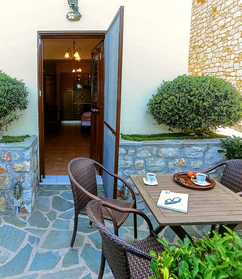 Αν και δεν διαθέτουν μπαλκόνι, τα Διαμερίσματα Ισογείου προσφέρουν έναν μικρό, ιδιωτικό εξωτερικό χώρο στην είσοδο, διαμορφωμένο σαν πατιό. Ο χώρος αυτός περιβάλλεται από φυτά και διαθέτει τραπεζάκι με καρέκλες, δημιουργώντας μια ήσυχη γωνιά για στιγμές χαλάρωσης στον προαύλιο χώρο του συγκροτήματος. Επιπλέον, τα διαμερίσματα παρέχουν απευθείας πρόσβαση στον εξωτερικό χώρο του ξενοδοχείου. Σημειώνεται ότι δεν είναι διαμπερή.
