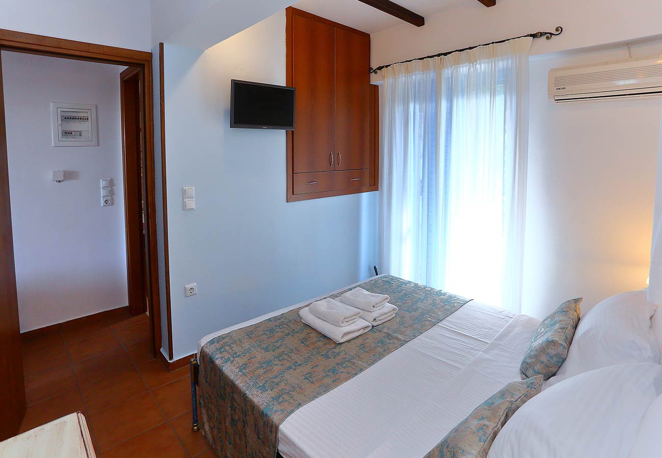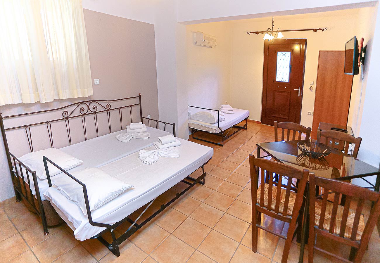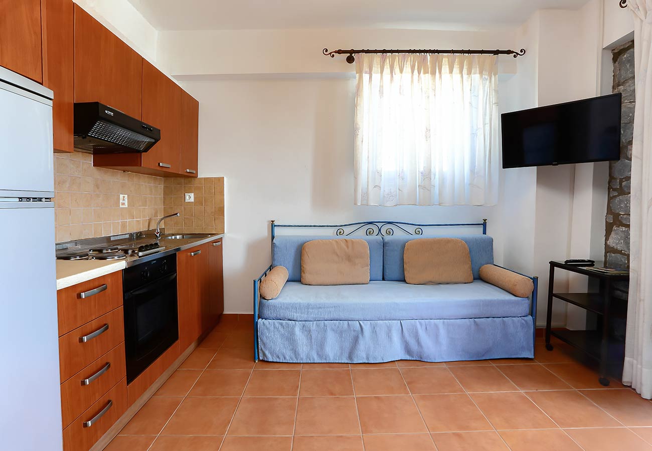 Το Οικογενειακό Διαμέρισμα ενός υπνοδωματίου με μερική Θέα στη Θάλασσα βρίσκεται στον πρώτο όροφο ενός παραδοσιακού πύργου. Τα Οικογενειακά διαμερίσματα συγκροτήματος κατοικιών Vathi διακρίνονται για την ποιοτική επίπλωση και την εξαιρετική διακόσμηση. Τα ευρύχωρα διαμερίσματα ενός υπνοδωματίου, συνολικού εμβαδού 40 τ.μ., διαθέτουν ένα διπλό κρεβάτι και ένα άνετο καθιστικό με καναπέ, που μπορεί να μετατραπεί σε κρεβάτι, φιλοξενώντας επιπλέον άτομα.