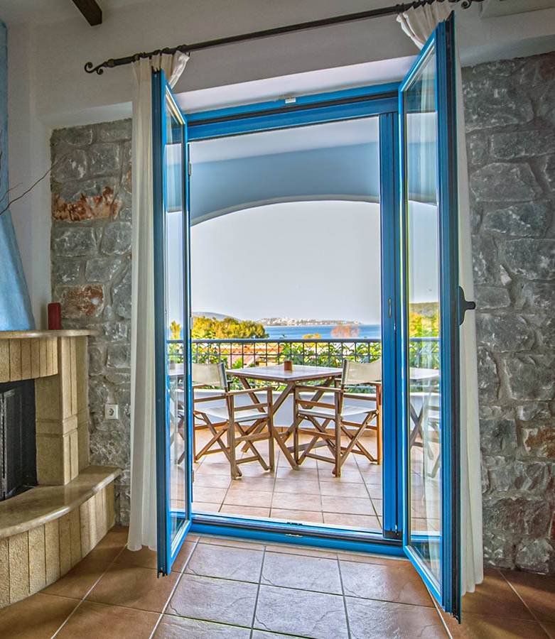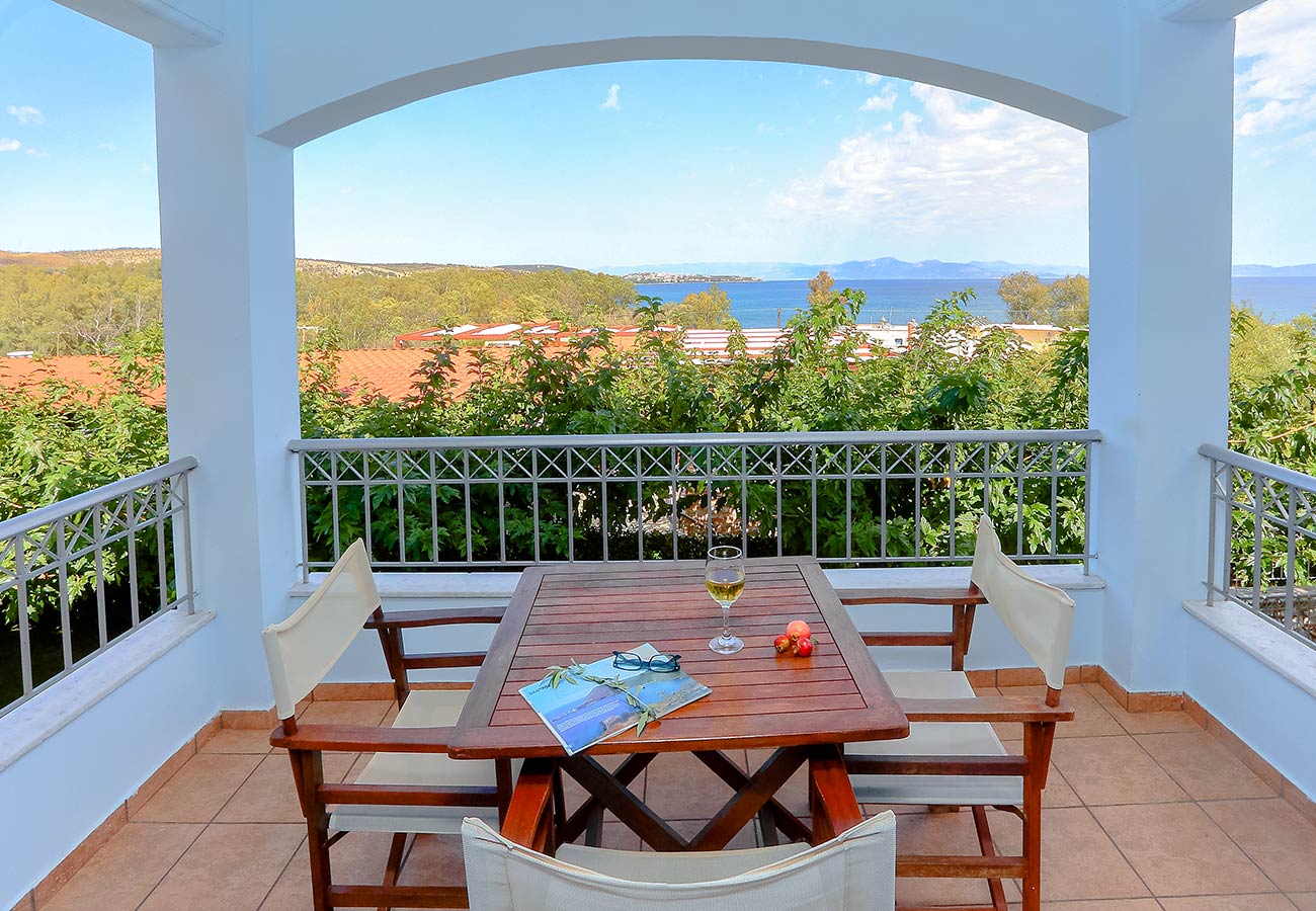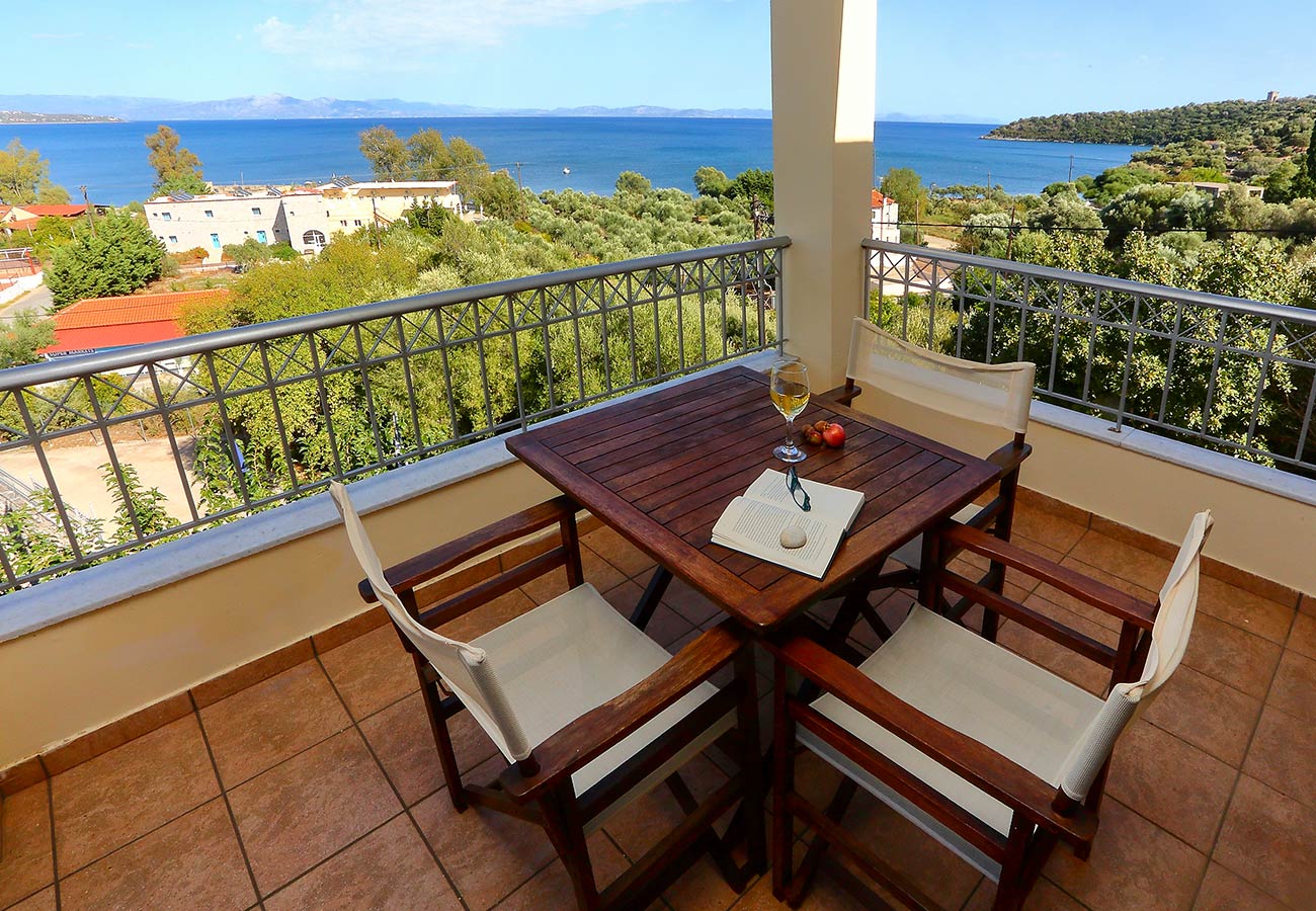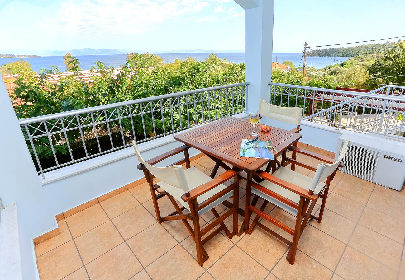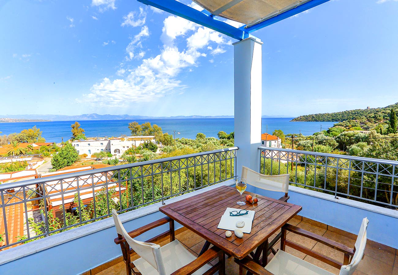 Τα διαμερίσματα είναι διαμπερή, με δύο ιδιωτικά μπαλκόνια και μαγευτική θέα, που συνδυάζουν τη μαγεία της φύσης και τη γαλήνη του υγρού στοιχείου, αφού το ένα έχει θέα προς το βουνό, ενώ το άλλο προς τη θάλασσα.