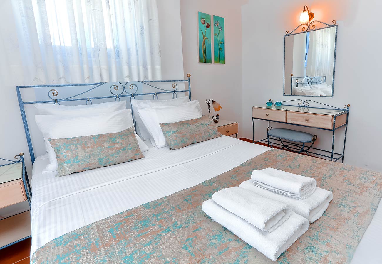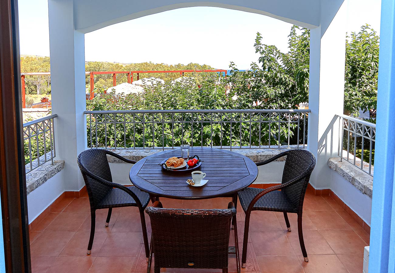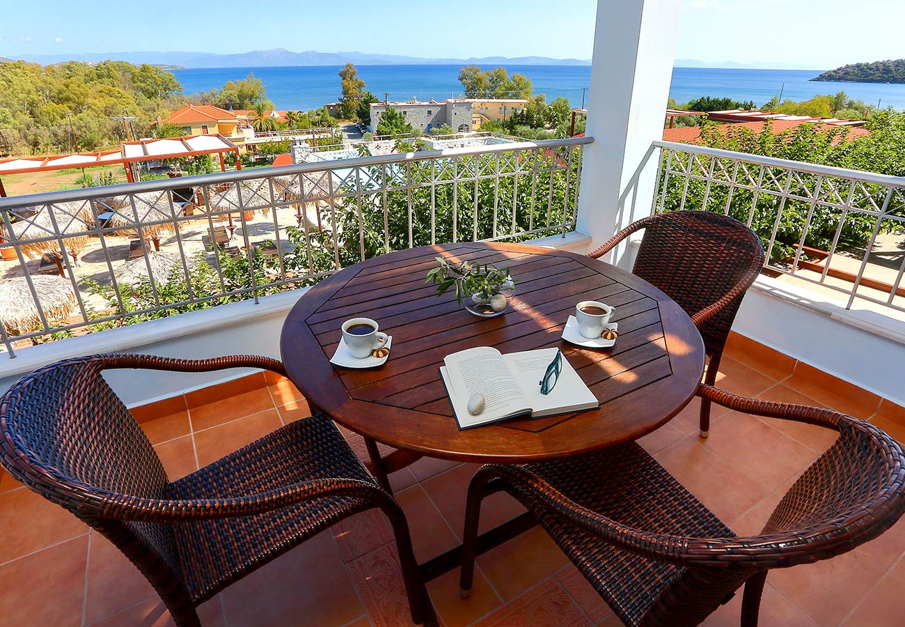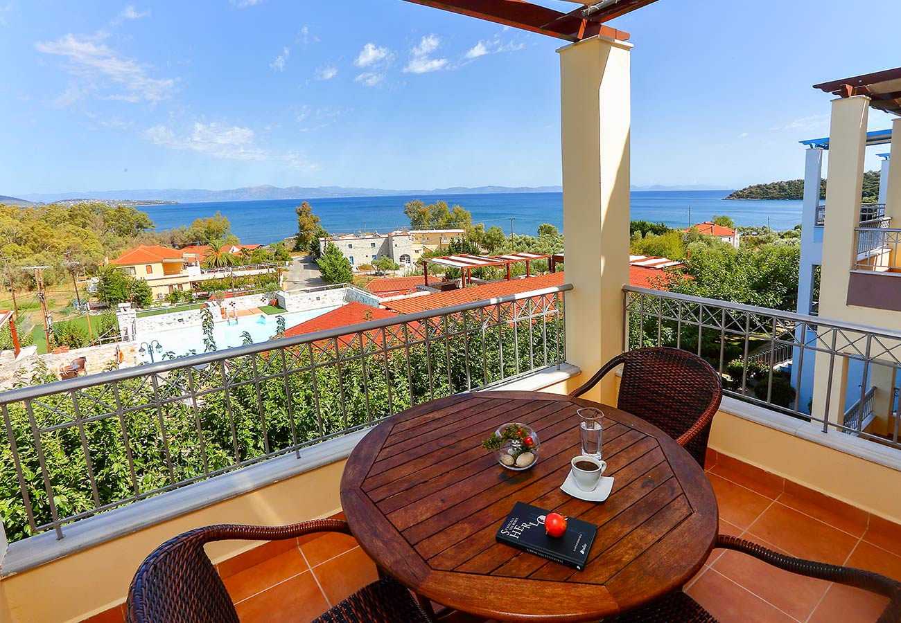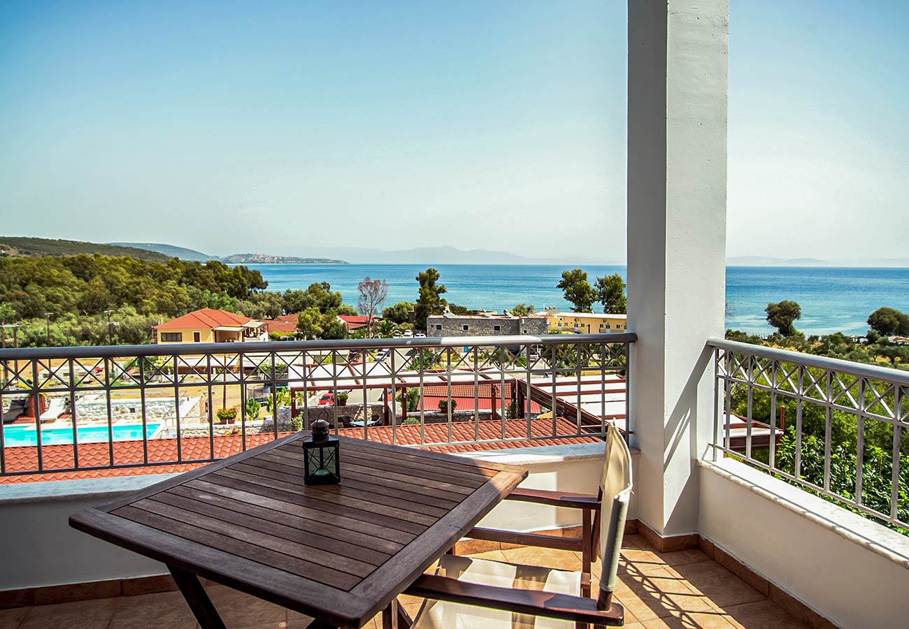 Τα διαμερίσματα είναι διαμπερή, με δύο ιδιωτικά μπαλκόνια και μαγευτική θέα, που συνδυάζουν τη μαγεία της φύσης και τη γαλήνη του υγρού στοιχείου, αφού το ένα έχει θέα προς το βουνό, ενώ το άλλο προς τη πισίνα και τη θάλασσα.